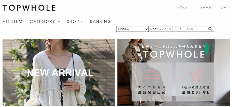TOPWHOLEは、レディースアパレルに特化した仕入れサイトで、韓国系やナチュラル系、オフィスカジュアル系まで幅広くラインアップしています。