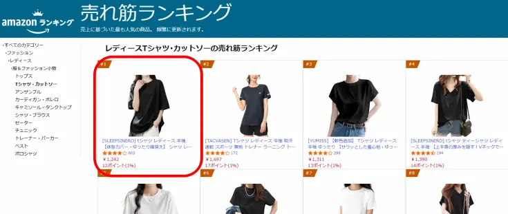 例えば、レディースTシャツ・カットソーの売れ筋ランキングでは、現時点では下図赤枠の商品が1位を獲得しています。