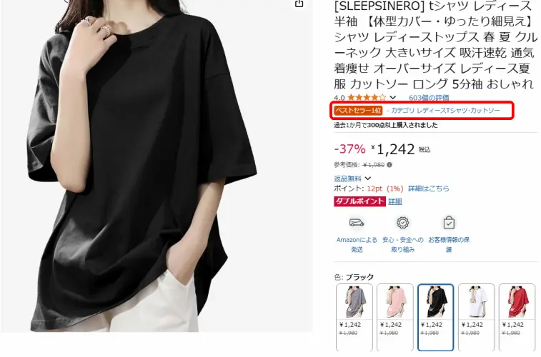 この商品ページを見ると、下図の赤枠箇所でわかるように、レディースTシャツ・カットソーカテゴリーでベストセラーバッジがついています。