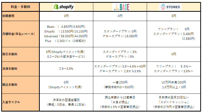 取引手数料や振込手数料では、「Shopifyペイメント」を利用することによって無料となるので、他の2社のサービスより有利です。