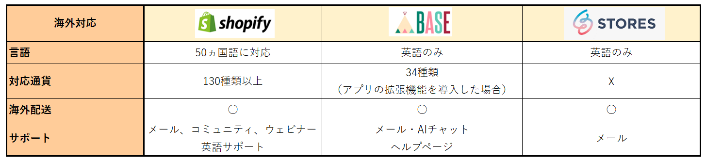 STORESも同様に、国内市場向けの設計が中心で、標準機能では多言語・多通貨に本格対応していません。